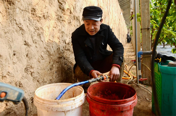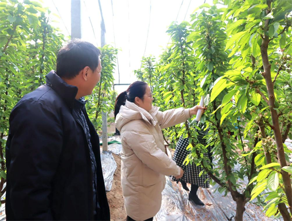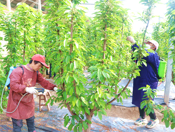 在樱桃种植大棚,村民正井然有序地给樱桃树进行摘心、浇水、授粉等一系列管护工作。孙恩弟正在调试的水肥一体化管网,给自家的樱桃园施肥。他说:“种植樱桃想要优质高产,管理必须要精细到位,其中水肥管理是果园管理中一项关键操作,水肥一体化管理不仅省时省力还能使农作物更好地吸收水分和营养,从而节省肥料和水”。
