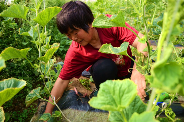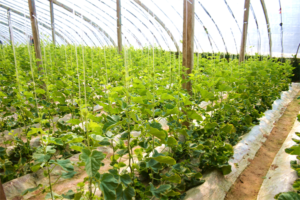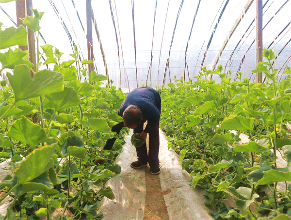 在另一座大棚里,甜瓜已经长出了幼果,在绿叶的掩映中煞是喜人,村民们正在给甜瓜剪老叶片。“现在我种植的西瓜、甜瓜有1.2亩,去年的甜瓜亩产近6000斤,价格每斤收购价8元,收益可观。种西瓜、甜瓜这条路我们选对了,收入增加了,生活也越过越好了。”李风君笑着说。