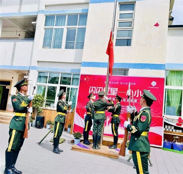 伴随着激昂的国歌声,庄严的五星红旗迎风飘扬,昂首挺胸的教官们英姿飒爽,身着迷彩军装的小兵们精神抖擞,朝气蓬勃。