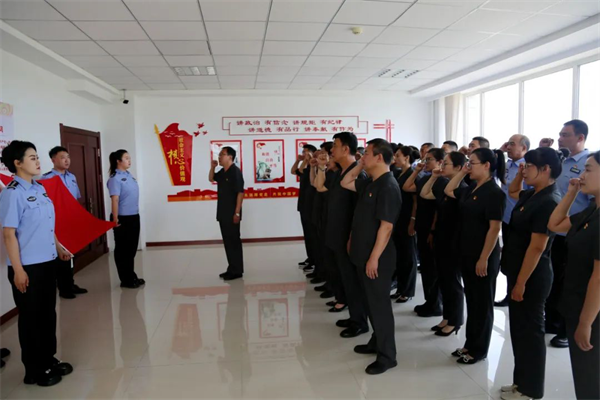 会议在雄壮的国歌声中拉开序幕,全体党员干警在鲜红的党旗下列队整齐,他们高举右手、握紧拳头,庄严宣誓,以饱满的精神再次接受党性的洗礼,铮铮誓言,彰显出他们的理想信念。