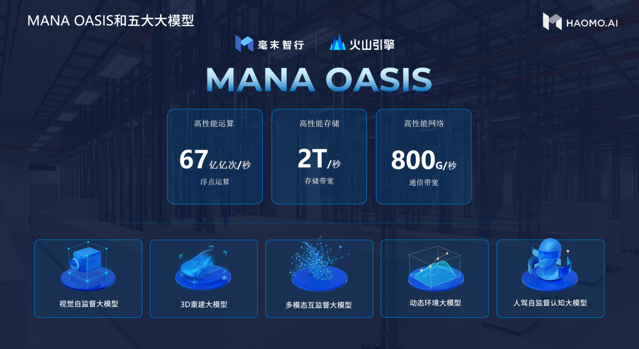在大模型技术成为引领新一轮全球人工智能趋势的当下,作为AI基础设施的大算力、大数据为大模型的演进提供了核心动力。毫末智行从创立之初,就定下以数据驱动自动驾驶技术升级的公司技术战略,以领先的人工智能技术和智能驾驶规模量产作为自身优势,在2021年底,率先发布国内首个全栈自研的自动驾驶数据智能体系MANA(雪湖)。为进一步应对海量的产品数据、超大规模数据训练、大模型的应用等大规模算力需求,毫末智行联合火山引擎,在2023年1月共同发布首个自动驾驶行业最大的智算中心MANA OASIS。