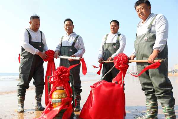 10月11日上午,随着现场重磅发布的《海洋宝藏》主题歌悠扬地响起,一艘载着海洋宝藏酒的捕捞船缓缓靠岸,首批海洋宝藏酒被从老尹家国家级海洋牧场的深海打捞上岸。随后,四名船夫将海藏酒缓缓抬到开坛典礼的活动现场。海藏文化创始人尹宝昌与众位嘉宾一起上台开启了第一坛海洋宝藏酒,只见酒瓶表面覆盖了样式各异的贝壳,就像一件独一无二的艺术品,让人拍手称奇。