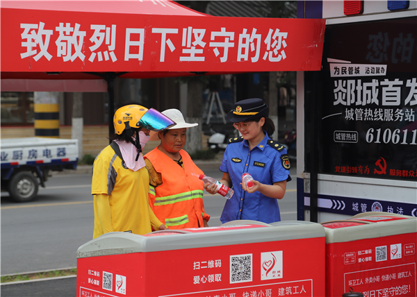 图为:郯城县综合执法局工作人员给户外工作者提供纯净水。