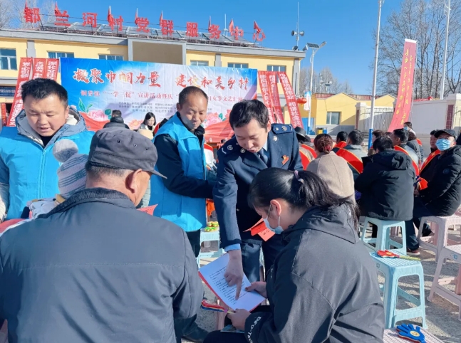 乌兰县税务局驻村干部刘宁在铜普镇三八妇女节活动上为群众宣讲中央一号文件和税惠政策 拍摄:唐剑