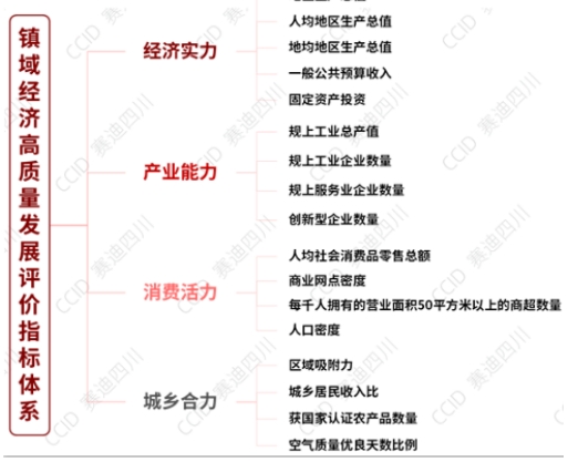 基于对镇域“联城带村”特点以及镇域经济高质量发展内涵的深入研究和理解,结合新型城镇化、乡村振兴等国家战略要求,以更加科学、合理、全面地评价镇域经济高质量发展水平为导向,赛迪四川镇域经济研究中心将2024镇域经济高质量发展评价指标体系由2023年的“经济实力、发展水平、工业水平、消费能力”调整优化为2024年的“经济实力、产业能力、消费活力、城乡合力”四个方面。2024镇域经济高质量发展评价指标体系共包括4个一级指标、17个二级指标,其中,二级指标较2023年净增加4个。此外,除上述主要指标外,本次评价也综合考虑镇域内上市企业数量、高等院校、省级以上创新创业载体平台、反映镇域经济社会发展的荣誉称号等支撑指标。