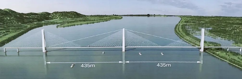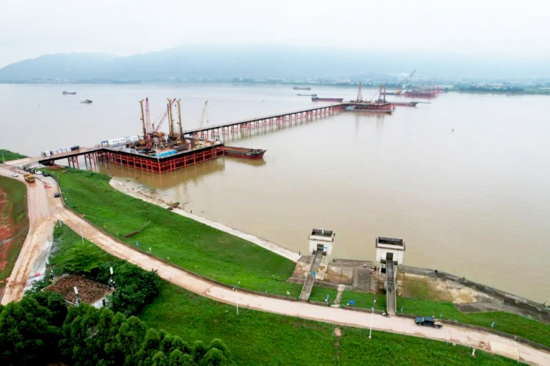 珠肇高铁连接珠海、江门、佛山、肇庆4城,其中,珠肇高铁西江特大桥段位于肇庆新区/鼎湖区永安镇,是珠肇高铁(高肇段)项目横跨西江航道的重要工程。主桥全长1307.6米,桥塔平均高172米,为国内首座三塔组合梁铁路斜拉桥,也是目前世界上跨度最大的钢箱组合梁铁路斜拉桥。