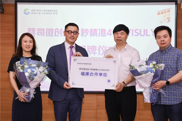 蔡司医疗眼科川藏业务负责人童小乔经理、蔡司医疗屈光产品全国经理李单为段俊国院长、周春阳主任授牌