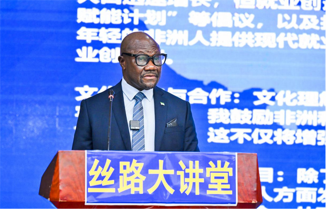 塞拉利昂驻中国大使馆副大使Saffa-Woya Rogers在致辞中表示,今天的丝路大讲堂是一次富有洞察力的活动,为我们提供了一个独特的机会,学习中非合作论坛峰会的成果,将这些成果落到实处,造福非洲青年。他从青年就业与技能培训、文化交流与合作、青年发展与合作项目三个方面,阐述了非洲青年的机遇。他热情洋溢地表示:非洲和中国的青年正站在一个新时代的前沿——一个以创新、互学互鉴和共同价值观为推动力的发展时代。