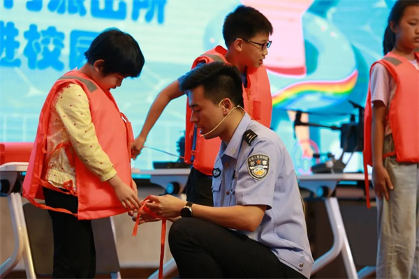 值得一提的是,在警用救生设备体验环节,民警现场展示并详细介绍了救生衣、救生圈、救生艇等救生设备的功能和使用方法,还邀请同学们亲自体验穿戴救生衣,让大家在实践中掌握正确的自救、施救技能,增强自我保护能力。