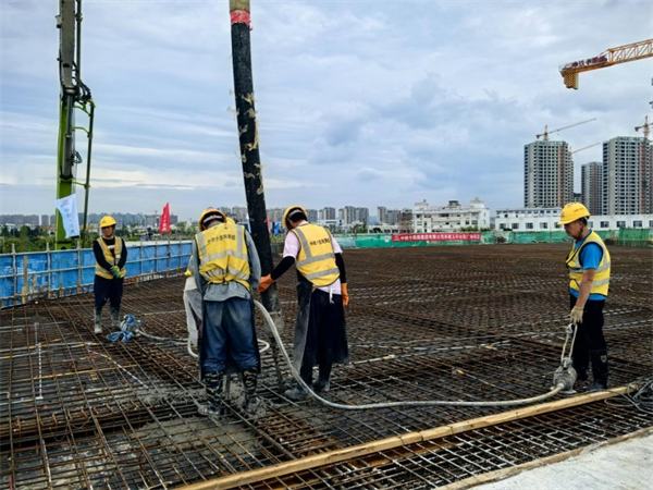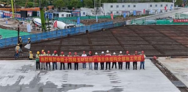 针对站前广场汽车库主体341米超长结构带来的施工难题,中铁十四局项目团队积极创新,采用多项新技术、新工艺、新工法和新材料。在混凝土中掺入高分子密实抗裂合材替代常规纤维型抗裂材料,有效补偿混凝土硬化过程中的收缩量,增强抗裂性能;将整体超长结构划分为多个较小施工段,优化施工工艺,缩短一次浇筑长度,降低混凝土浇筑时温度变化的影响,防止混凝土开裂;联合设计院对梁板施加预应力,解决超长结构梁板跨度过大问题,减小梁板结构尺寸,优化配筋数量。