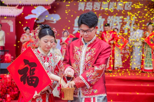 6月14日,青岛西海岸新区第二届婚俗文化节在该区隐珠街道烟台东社区举行。本届婚俗文化节以“海誓山盟·爱尚西海岸”为主题,涵盖传统婚俗展演、集体婚礼、非遗体验、互动交友等主题活动,在展现婚俗文化独特魅力,倡导文明简约、和谐温馨婚嫁新风尚的同时,融合优质文旅资源,链接优质婚育服务、婚嫁行业、零售餐饮等传统业态,推动“甜蜜经济”发展。
