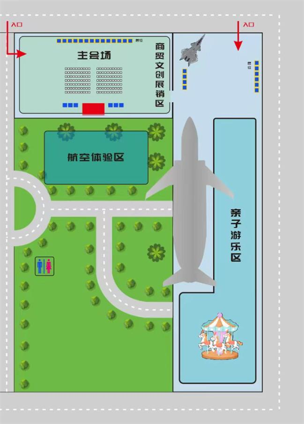 本次嘉年华活动精心规划一个主会场+四个航空体验场景+N个餐饮住宿消费场景。主会场内容丰富,划分为商贸文创展销区、亲子游乐区、航空体验区三大核心区域。