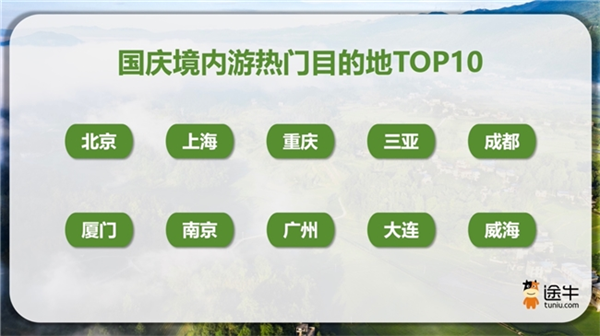 国庆境内游方面,北京、上海、重庆、三亚、成都、厦门、南京、广州、大连、威海等是截至目前途牛用户预订的热门。