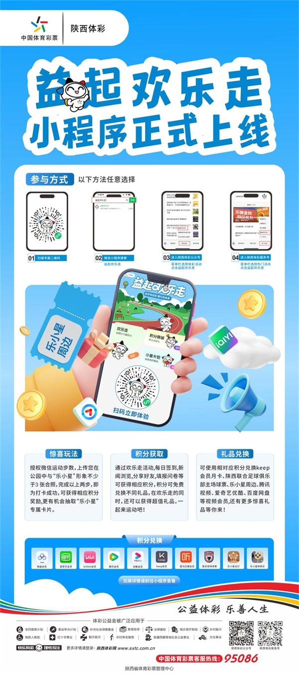 作为国家公益彩票,陕西体彩始终将“公益体彩·乐善人生”的理念深植于发展之中。多年来,体彩公益金广泛用于全民健身体育设施建设、奥运争光计划实施、教育助学、城乡医疗救助、红十字事业、农村养老服务等多个领域,切实为民生福祉与社会公益事业添砖加瓦。此次“益起欢乐走”小程序的推出,正是陕西体彩将公益理念与群众日常健身结合的创新实践——市民每一次参与运动、完成打卡,都是在以轻松的方式为公益事业“助力”,让运动的价值超越健康本身,延伸至更广阔的社会关怀。(陕西省体育彩票管理中心)