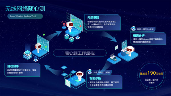 几十次线上会议、无数次方案打磨……党组织搭建起技术与需求间的坚实桥梁。党员骨干带头攻关,基于元景网络大模型,创新打造“无线网络随心测智能体”服务,实现“自然语言指令+图形化操作”双模式联动,系统主动发现问题,一线用户利用Agent获取问题根因分析、生成优化解决方案和效果评估,现场作业完成后,系统会自动验证解决效果,最终实现问题自动化闭环。它重构了工作流程——用户只需一句话,如“查看8月1日上海市长宁路整体指标情况”,查询的道路指标便瞬间呈现;它消除了用户使用门槛——一句话就能让11个“隐藏功能”一目了然,彻底告别繁琐培训;它突破了时间限制——全国道路7×24小时随时测、全量测、自动测,让道路测试永不停歇,重塑通信网络优化的未来图景。