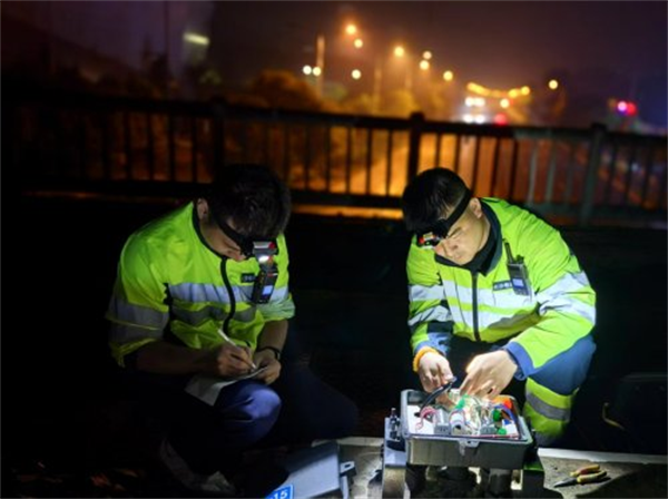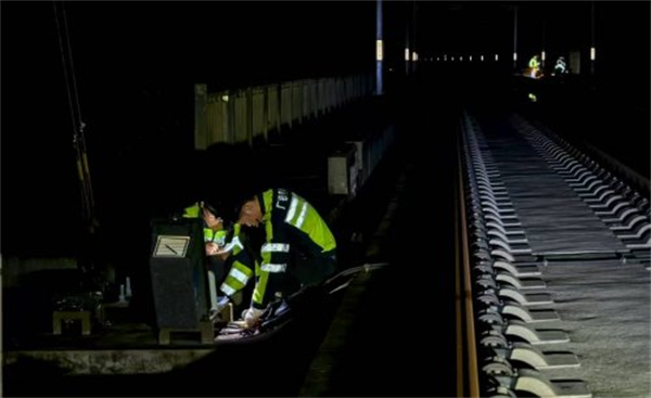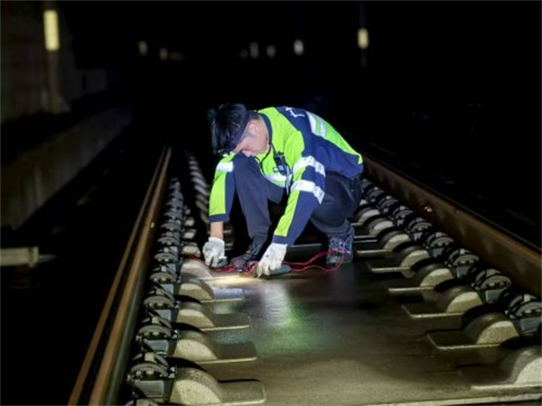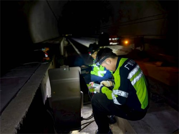 即便如此,午夜的高温仍是巨大挑战。在闷热的午夜,工人们的头灯在黑暗中划出一道道光芒。他们或俯身紧贴信号箱盒,仔细测试每一个电路参数;或跪在钢轨间,借着灯光检查应答器的状态。