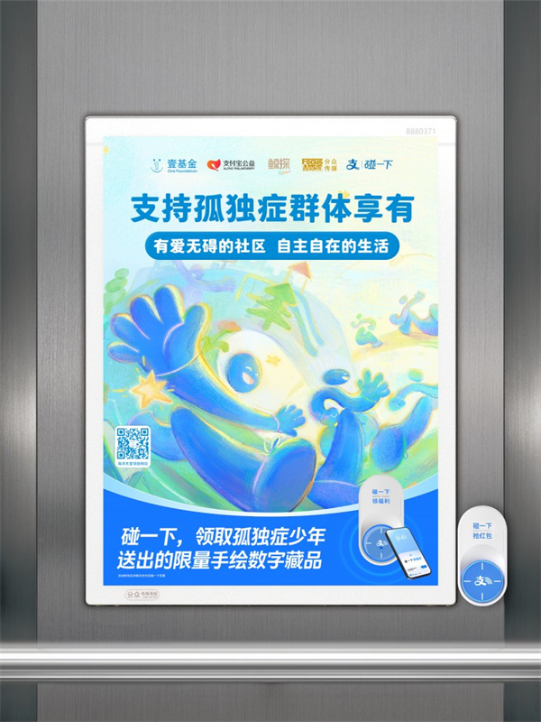 在今年“中华慈善日”期间,在电梯里,用户“碰一下”分众传媒的公益海报,可以轻松领取由“壹基金海洋天堂计划”的受益孤独症少年手绘画作定制的鲸探数字藏品,这也是将公益传播从“被动观看”变为“主动体验”,首次应用“碰一下”技术开创公益互动参与新模式。