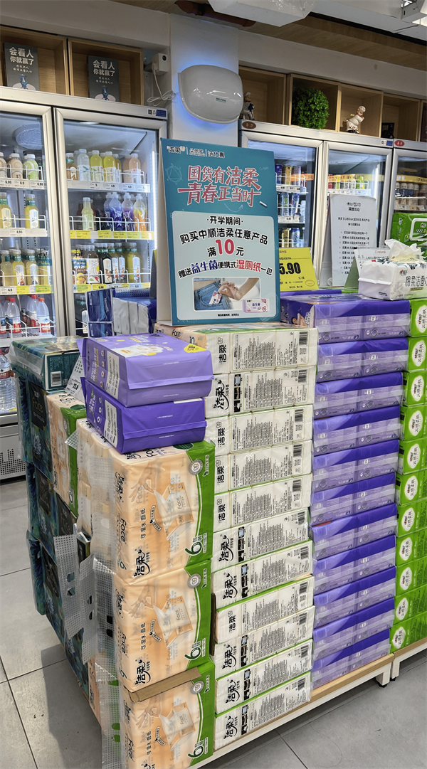 开学期间,中顺洁柔在全国多个战区同步推进高校促销活动。在华南、西南、华北、华东等多地高校超市中,洁柔设置的专属堆头和人气货架吸引大量学生驻足选购。Face系列抽纸、油画纸巾、便携手帕纸、蚕丝柔洗脸巾、益生菌湿厕纸等产品以差异化功能和高性价比,覆盖从宿舍、教室到运动、社交等多种校园用纸场景,复购率持续走高。