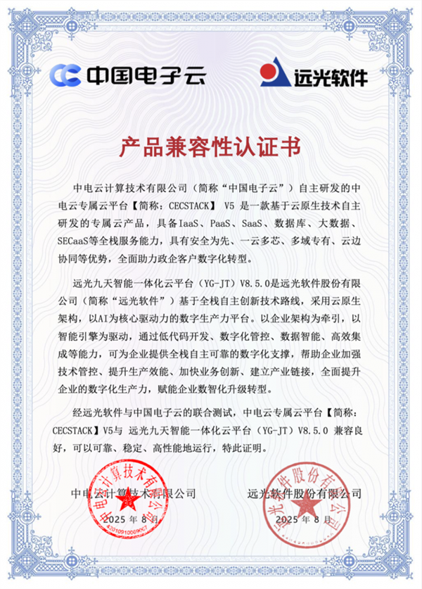 发布时间:2025-09-24 13:11:50 | 来源:中国网 | 作者: | 责任编辑:吴一凡近日,远光软件自主研发的九天智能一体化云平台(YG-JT)与中国电子云·中电云专属云平台V5版本完成双向兼容性互认证。