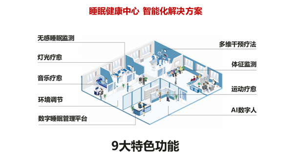 智能睡眠研究中心搭载无感睡眠监测、灯光疗愈、音乐疗愈、环境调节、数字睡眠管理平台、多维干预疗法、体征监测、运动疗愈、AI数字人等九大特色功能,为睡眠障碍人群提供了精准化、无感化的睡眠健康服务,推动睡眠监测从单一设备到多终端协同的升级,从传统需主动操作的干预模式,升级为更贴合人体睡眠节律的智能被动干预,为睡眠健康管理赋予更具智能化的科技体验。