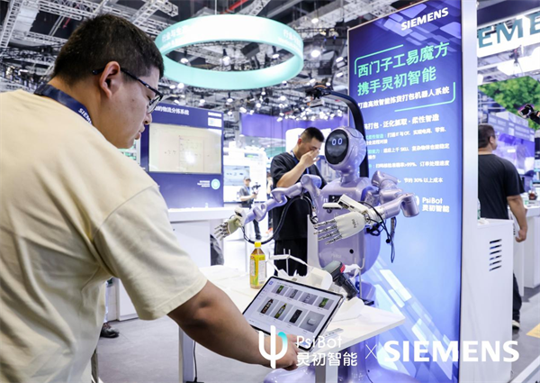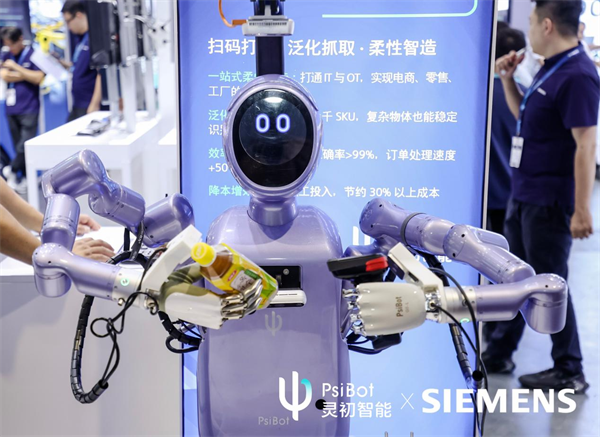发布时间:2025-09-26 10:08:49 | 来源:中国网 | 作者: | 责任编辑:吴一凡第25届中国国际工业博览会于9月23-27日在上海举办,国内具身智能领军企业灵初智能(PsiBot)与西门子工易魔方(Workflow Canvas)深度协作,共同展出智能拣货打包机器人系统,演示了从下单、拣货、扫码到打包的全流程自动化协作。