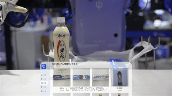 收到用户下单指令后,机器人双手协同,完成商品抓取与扫码
