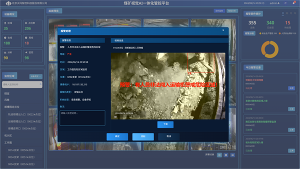 图为煤矿视觉AI一体化管控平台现场运行效果