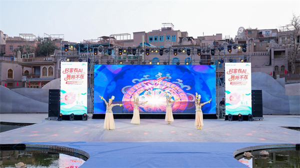 活动深度融合新疆民族艺术与现代数字技术,通过多元形式将“文化润疆”“乡村振兴”与企业服务实践紧密结合,展现了边疆群众对美好生活的向往。活动现场,喀什古城洋溢着欢乐氛围。新疆民族歌舞奏响欢快节奏,台下观众纷纷随之律动,民族乐器演奏赢得阵阵喝彩,浓郁的地域文化魅力尽显。前期线上征集的7组“麦西来甫TV趣味家庭展演赛”嘉宾,以精彩歌舞献上视听盛宴。百万粉丝博主“新疆石榴哥”艾尼、阿杰及“大玉的侣途”亲临现场参与互动,多轮抽奖送出华为平板电脑、儿童手表等丰厚奖品,持续点燃现场热情,活动不仅为当地群众搭建了公共文化展示平台,更传递出“民族团结一家亲”温情。