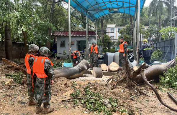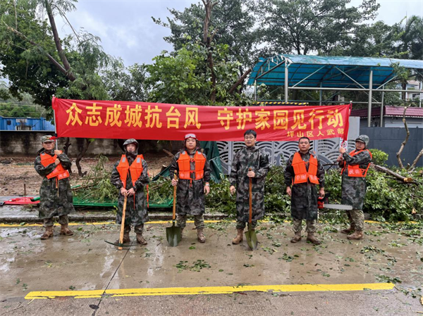 高效出动奋战一线。台风过境后,组织力量抢抓时间开展灾后恢复工作。民兵队伍身披雨衣,携带油锯、铁锹等工具赶往各道路、住宅区,耐心疏通积水水道,清理搬运断折跌落的树干树枝,用满身汗水和辛勤付出换来人民群众顺畅出行和正常工作生活。雨后的泥水沾满了他们的裤脚和作战靴,一位民兵笑着表示,“平时服务、急时应急、战时应战就是我们的职责,身为一名民兵,能奋战在一线、在人民群众有需要的时候做出自己的贡献,我感到很光荣”。