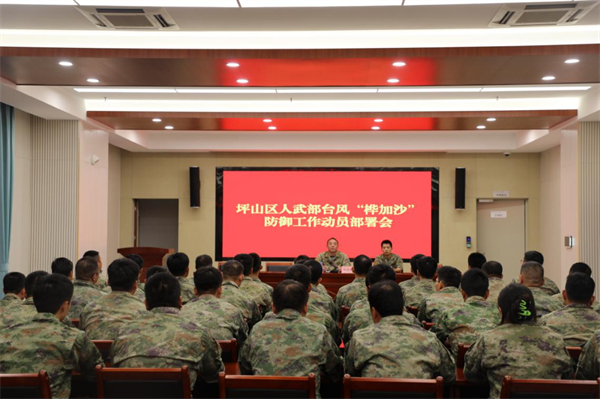 迅速反应集中部署。接到台风预警信息后,坪山区人武部第一时间做出行动,召开台风“桦加沙”专题会议,严格落实上级有关指令要求,充分发挥我部职能使命,全面筹备台风防御工作。召集民兵力量严阵以待,强化值班备勤细化部署,成立防台应急攻坚组、救援组、保障组和服务组,严肃强调了防范台风中的群众纪律和工作纪律,要求所有官兵职工及备勤人员坚守战位,严禁私自外出,杜绝疏忽轻视,“宁可十防九空,不可一次放松”。