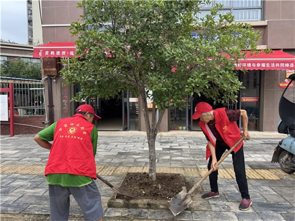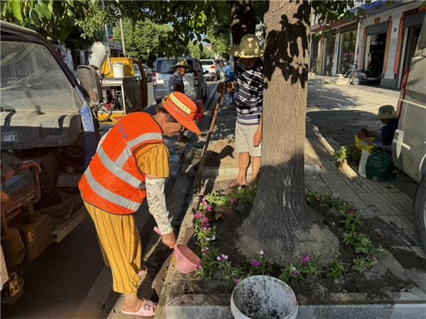 七月起,社区陆续试验多个花种,最终选定耐活、花期长的长春花,作为街道美化主打品种。随后,汪集街道组织城管队员、社区工作者、环卫工人、志愿者分工协作,清运垃圾杂物、翻松板结土壤、移栽花苗,还在花坛周边增设分类垃圾桶,引导居民规范投放。为防止问题反弹,创新推出“树穴认领”机制,发动商户、住户成为“花长”,负责门前花卉的日常照料。志愿者们定期浇水、除草、清理落叶,城管、环卫巡查工作时也“顺手”护绿,一种“共治共管、花开共享”的新风尚正蔚然成风,形成“环境美化+蚊虫防控”的双重保障。靠近武汉问津职业学校的荣生路南段,则由花卉专业的学生负责,他们种上了红掌等特色花卉,为街道添了一笔青春的亮色。