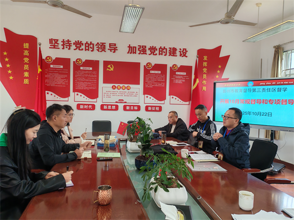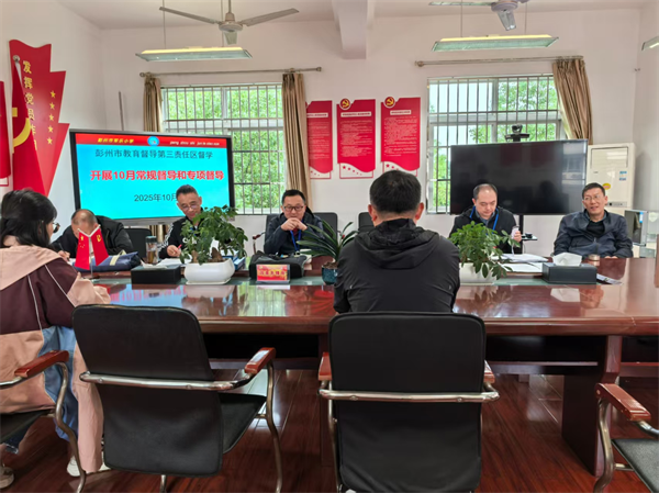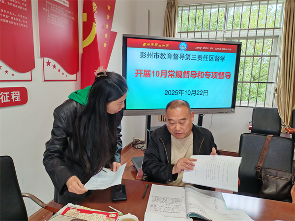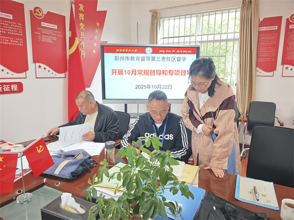 2025年10月22日,彭州市教育局第三责任区督学冯小飞、王云刚、周成安、廖静萍、彭云玖一行莅临军乐小学,开展10月常规督导和专项督导。本次督导聚焦扩优提质行动、“十百千”工程及“双特”建设三项重点工作的推进情况。