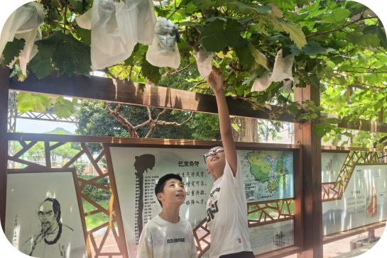 依托上山文化、浦江葡萄、江南第一家等本土特色资源,浦江县黄宅镇前陈中心小学通过开发校本课程、建设校园生态园、组织种植基地参观及农耕实践等方式,引导学生深入田间地头,体验真实的农村生活,感知“农业浦江”的深厚底蕴。作为浦江农业的支柱产业,葡萄种植成为劳动教育的重要载体。前陈中心小学不仅邀请县葡萄产业协会专家带领师生走进种植基地,识别不同葡萄品种,更围绕“采摘—质检—包装—收购”全流程设计劳动实践活动,系统提升学生的农业认知与劳动素养。该校校长徐素珍表示:“我校结合区域特色,创新开发以葡萄为主题的劳动课程。学生在实践中不仅提升了劳动能力,也增强了对家乡的认同与热爱。”