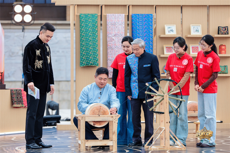 本场录制走进成都市双流区广都博物馆,围绕“推进文商旅体深度融合发展”设置了四大极具代表性的技艺挑战项目。在《美“锦”佳人》的挑战舞台上,76岁的蜀锦大师胡光俊携三位徒弟展开一场技艺与审美的较量。首轮“辫带线下料”,选手们须在一分钟内将辫带线整齐缠绕三十圈,不容一丝缝隙;次轮“目板穿通丝”,挑战者要在五分钟内将通丝按照工艺数据的严格要求穿过目板孔洞,不能穿漏或者穿错,一孔错,整匹锦缎皆损;末轮“蜀锦服饰搭配”,则考验选手于两分钟内,以不超过四件蜀锦制品为模特打造典雅造型。“匠心观察员”单霁翔亲身体验穿通丝之难后,由衷感叹,“每一根丝线,都承载着千年文化的重量。这般精益求精、细致严谨,正是对文化最扎实的敬畏。”