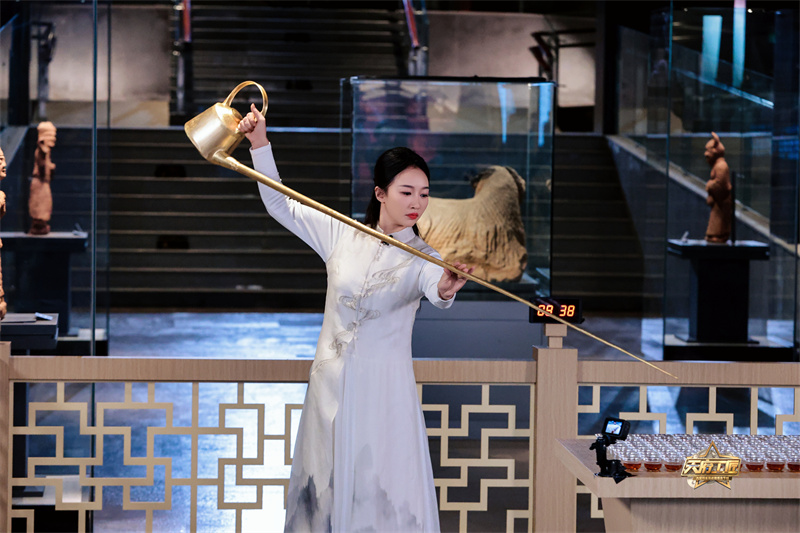 挑战项目《行云流水》则将非遗茶艺推向新高度。四川工匠、成都工匠向春,以“盲品辨茶”拉开序幕——仅凭一缕茶香、一口滋味,便精准道出八款茶叶的产地与采制时节,仿佛与每一片茶叶进行着跨越山海的对话。随后,她执起特制的两米长铜壶,开启一场力与美的精准博弈。一分钟内,从百杯之中择取其中26盏注入茶水并且连成“工”字,更要求每杯水量的误差不超过0.1厘米。在挑战过程中,向春通过腰腹发力稳定壶身,在壶嘴微抖的瞬间迅速调整,最终以零洒漏、水量误差仅0.05厘米的精准表现完成挑战。