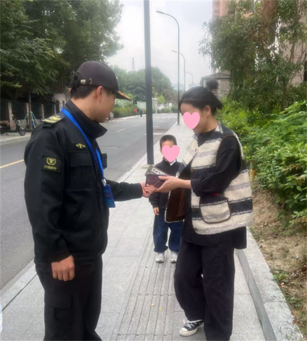 近日,海宁市海洲街道综合行政执法队市容管理人员洪江平巡查至海洲街道洛塘河边三里亭路时,发现地上有一部手机。洪江平上前捡起手机,发现手机设置了密码,无法联系失主。洪江平立即将情况在工作群向领导汇报,并将手机带至梅园岗亭。后通过回拨未接电话,联系到失主告知其手机所在的位置,并安抚失主着急的情绪。