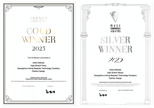 欧定头等舱高弹休闲西服荣获2025缪斯设计奖银奖