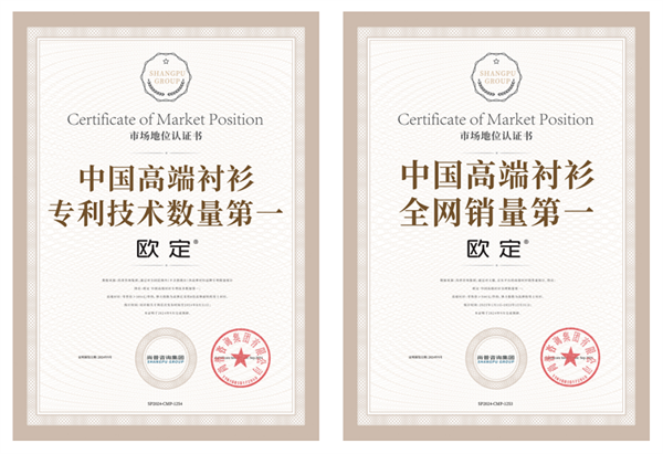 欧定稳居中国高端衬衫全网销量第一,并获“中国高端衬衫专利技术数量第一”认证