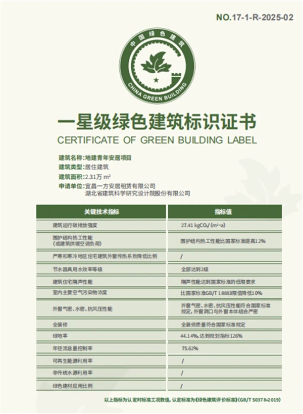 发布时间:2025-11-06 15:27:18 | 来源:中国网 | 作者: | 责任编辑:孙玥2025年10月28日,由中国化学工程第十六建设有限公司承建的宜昌“地建青年安居项目”,正式获评国家住建部一星级绿色建筑标识,成为宜昌市首个获得绿色建筑标识的住宅类项目,标志着公司在绿色建筑领域的实践取得重要突破。
