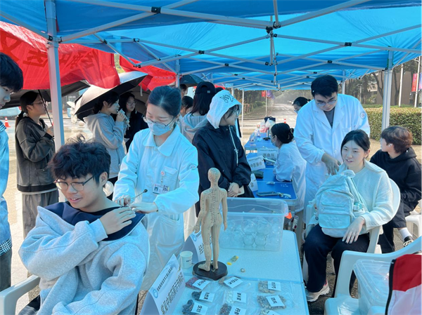 活动现场设置了多个特色体验区,各环节有序衔接,气氛热烈。中医师们凭借精湛技艺,耐心为师生进行把脉、推拿、拔罐等传统诊疗体验,为前来咨询的师生“望闻问切”,用通俗的语言讲解中医基本原理。同时,针对不同体质给出了个性化的健康建议,让师生们切身体验到中医“辨证施治”的独特优势。秋季养生花茶品饮区也吸引了一大波学生前来品尝,医务人员详细介绍花茶的配方、功效及适宜人群。师生们手持温热的饮品,在秋雨中感受着中医药带来的温暖。