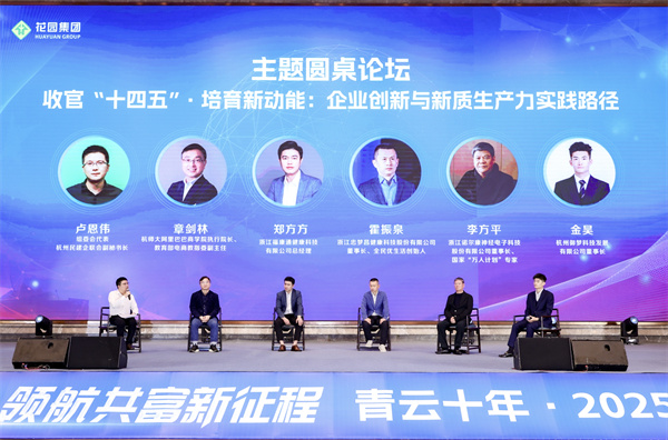 在青云浙商组委会主任、中国网数字经济频道总监卢恩伟主持下,杭师大阿里巴巴商学院执行院长、教育部电商教指委副主任章剑林教授与中国乳制品工业协会副理事长、全民优生活品牌创始人霍振泉,浙江诺尔康神经电子科技董事长李方平,浙江福康通健康科技有限公司总经理郑方方,杭州御梦科技发展有限公司董事长金昊共同回顾“十四五”创新实践,探讨在“十五五”中的发展方向。