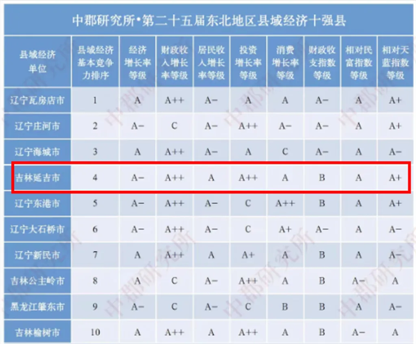 其中,吉林省延吉市连续25年持续位居东北十强县,排名始终位列吉林第一。