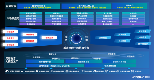 发布时间:2025-11-21 10:54:05 | 来源:中国网 | 作者: | 责任编辑:吴一凡为响应党和国家号召,助力解决城市发展痛点堵点问题,浪潮软件研发推出浪潮软件“人工智能+城市治理”整体解决方案。该方案面向政府部门、企业群众,基于浪潮数字政府业务积累、技术积淀、基座优势,以灵犀有言融合DeepSeek、Qwen打造浪潮城市治理大模型,构建城市生命线、全域安全、城市运管、政务热线等城市智慧大脑(智能中枢),打造内涝预警、电气火灾超前预警、消防巡检、秩序监测、林地监管等AI应用场景,提供智能预警、监督、评价、派单、处置、上报、咨询、检索等AI辅助能力。以数智手段助力全国各地城市韧性、安全、智慧水平提质升级。