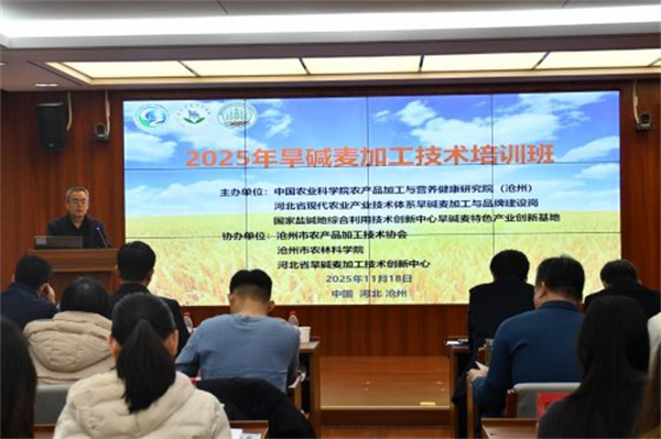 为深入贯彻落实国家粮食安全与乡村振兴战略,推动河北省旱碱麦产业提质增效,2025年11月17日至18日,“2025年旱碱麦加工技术研讨会”在沧州顺利召开。本次会议由河北省农业产业体系旱碱麦加工与品牌建设岗、国家盐碱地综合利用技术创新中心旱碱麦特色产业创新基地、中国农业科学院农产品加工与营养健康研究院(沧州)联合主办,中国农业科学院农产品加工研究所、河北省旱碱麦加工技术创新中心、沧州市农林科学院、沧州市农产品加工技术协会共同协办。会议聚焦旱碱麦加工与品质评价关键技术,搭建产学研深度融合平台,为产业高质量发展注入科技新动能。