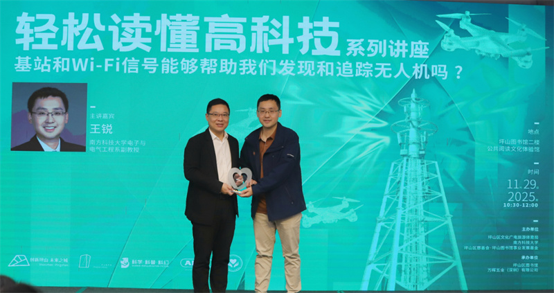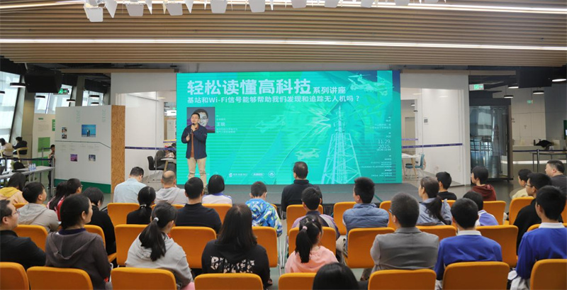 发布时间:2025-12-02 16:12:19 | 来源:中国网 | 作者: | 责任编辑:孙玥11月29日上午,深圳市坪山区图书馆二楼公共阅读文化体验馆座无虚席,2025“轻松读懂高科技”系列讲座第六场在此火热开启。南方科技大学电子与电气工程系副教授王锐以《基站和 Wi-Fi信号能够帮助我们发现和追踪无人机吗?》为题,用通俗易懂的案例、生动形象的比喻与严谨的学术逻辑,结合自身科研经历,带读者解锁无线电波的奥秘,感受科技赋能生活的奇妙。