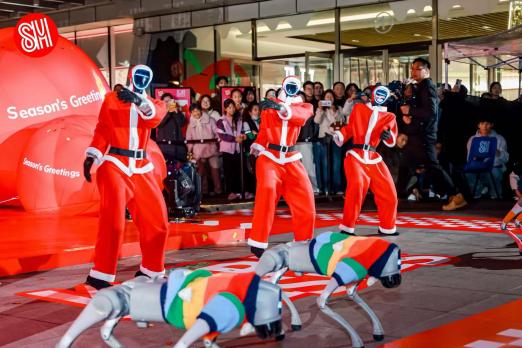 活动当天,有节日氛围感,雪花、苹果主景装置等登场;有科技感,智能AI机器人现场巡游热闹互动;会玩梗,真人人工智能圣诞老人全场闪现派礼,在浓浓的好运氛围中,近10米高的苹果美陈主装置被点亮。