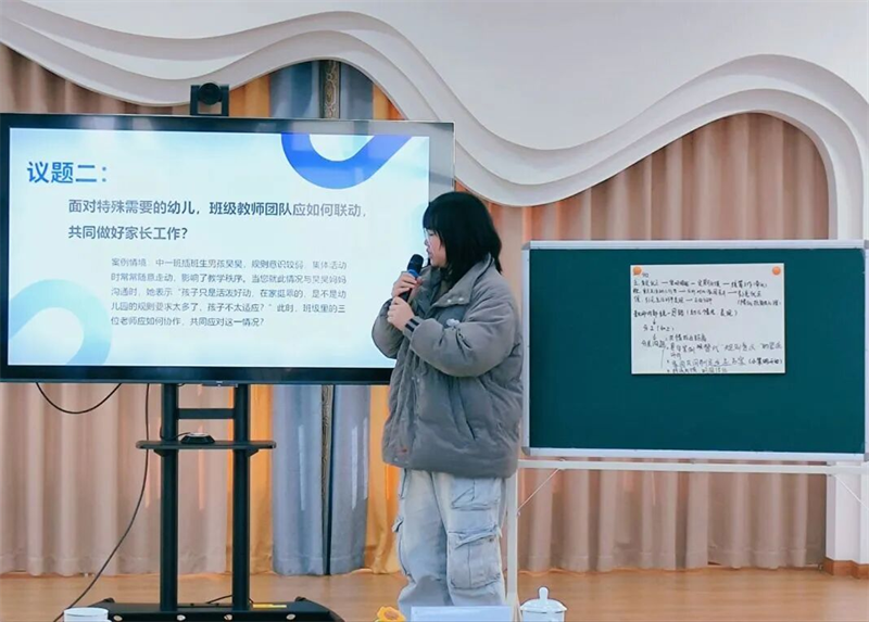 第二组教师聚焦“面对特殊需要的幼儿,班级教师团队应如何联动做好家长工作”展开深度研讨,剖析核心要点,明确班级教师团队既要分工清晰,更要凝聚合力,通过信息同步、策略一致、情感同频,构建稳固的家园支持闭环。