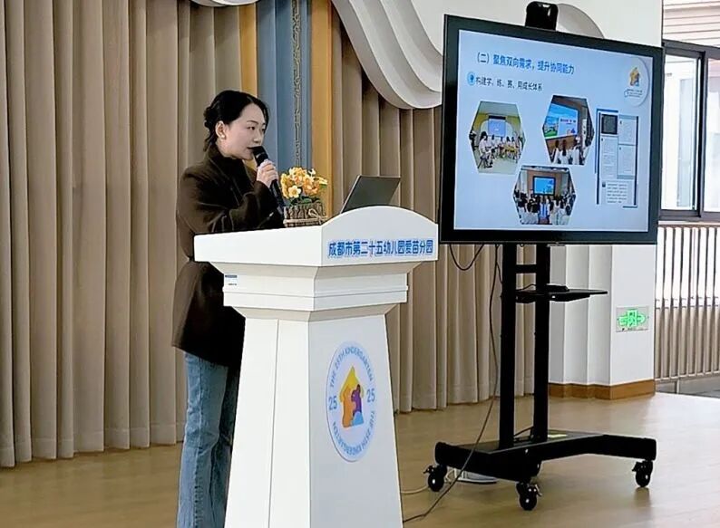 成都市第二十五幼儿园爱苗分园教学助理杰瑞老师在专题《基于双向赋能理念下家园共育的思与行》中,阐释了双向赋能与家园共育的核心价值,分享了实操性的家园共育新形式,以及集团-园级-班级具体赋能措施、实施路径、操作步骤等。