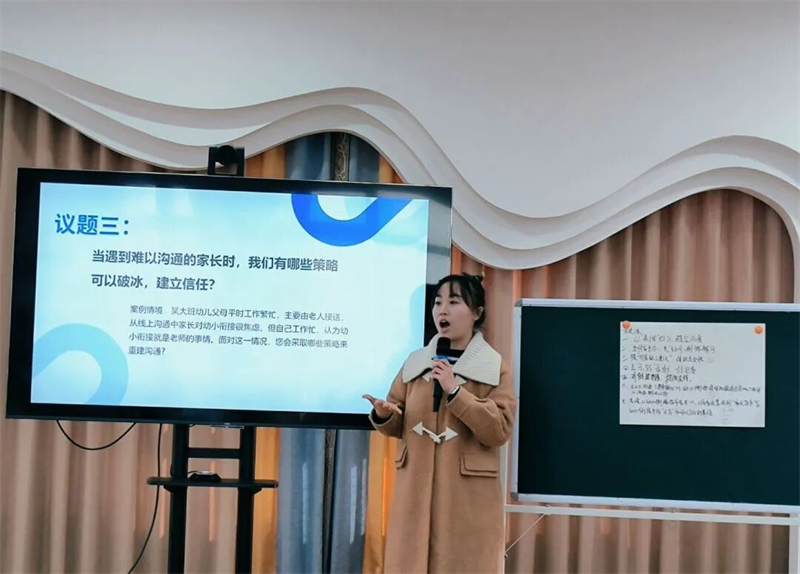 第三组教师针对“当遇到难以沟通的家长时,可采取哪些策略破冰建立信任”进行集中研讨,提出面对沟通坚冰,需以共情为基础、以倾听为桥梁、以微小可行的行动为抓手,实现家园关系的有效破局。