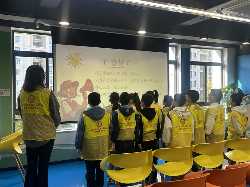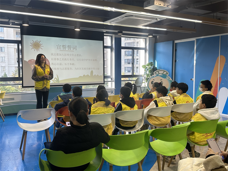随后,活动迎来最庄重神圣的环节——宣誓仪式。小童心社会工作服务中心理事长吴静老师带领全体“彭埠少年”庄严宣誓!少年们全体起立,齐声宣誓:“我志愿加入彭埠少年志愿队,以青春之名践行责任,以行动守护社区温暖,热心公益、乐于奉献,积极参与志愿服务,为社区发展贡献青春力量!”铿锵有力的誓言在活动现场久久回荡,这不仅是少年们对志愿事业的郑重承诺,更是他们未来践行志愿精神的坚定指引。宣誓完毕后,吴静老师叮嘱道:“希望你们牢记誓言,让志愿服务成为一种习惯,让奉献精神伴随一生。”